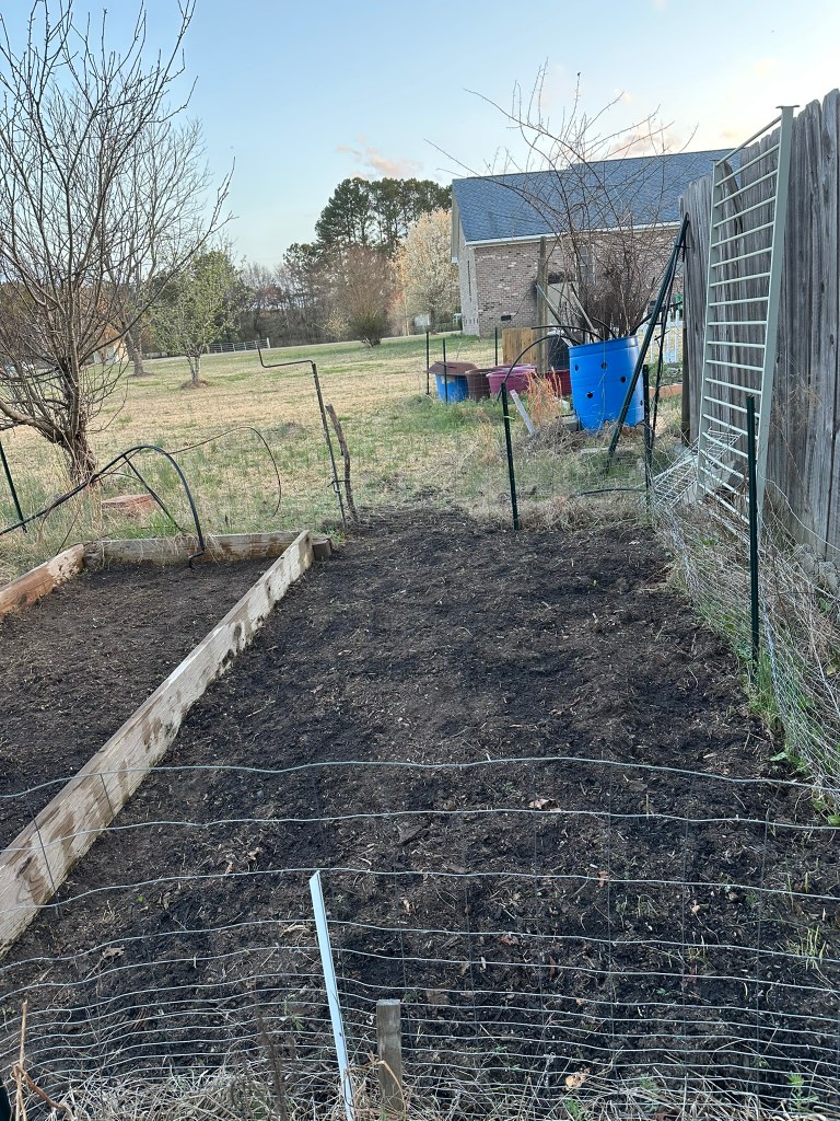 The final gift for me was to add Ironite White Pellets and Fertilizer 8-8-8 to the soil which is a little less in power than the ole fashion 10-10-10. This process is exciting because it takes me back to working with my dad and getting deep down in the soil with your hands prepping it to hopefully steer it ready for planting veggies. I am excited about every step developed on this journey.